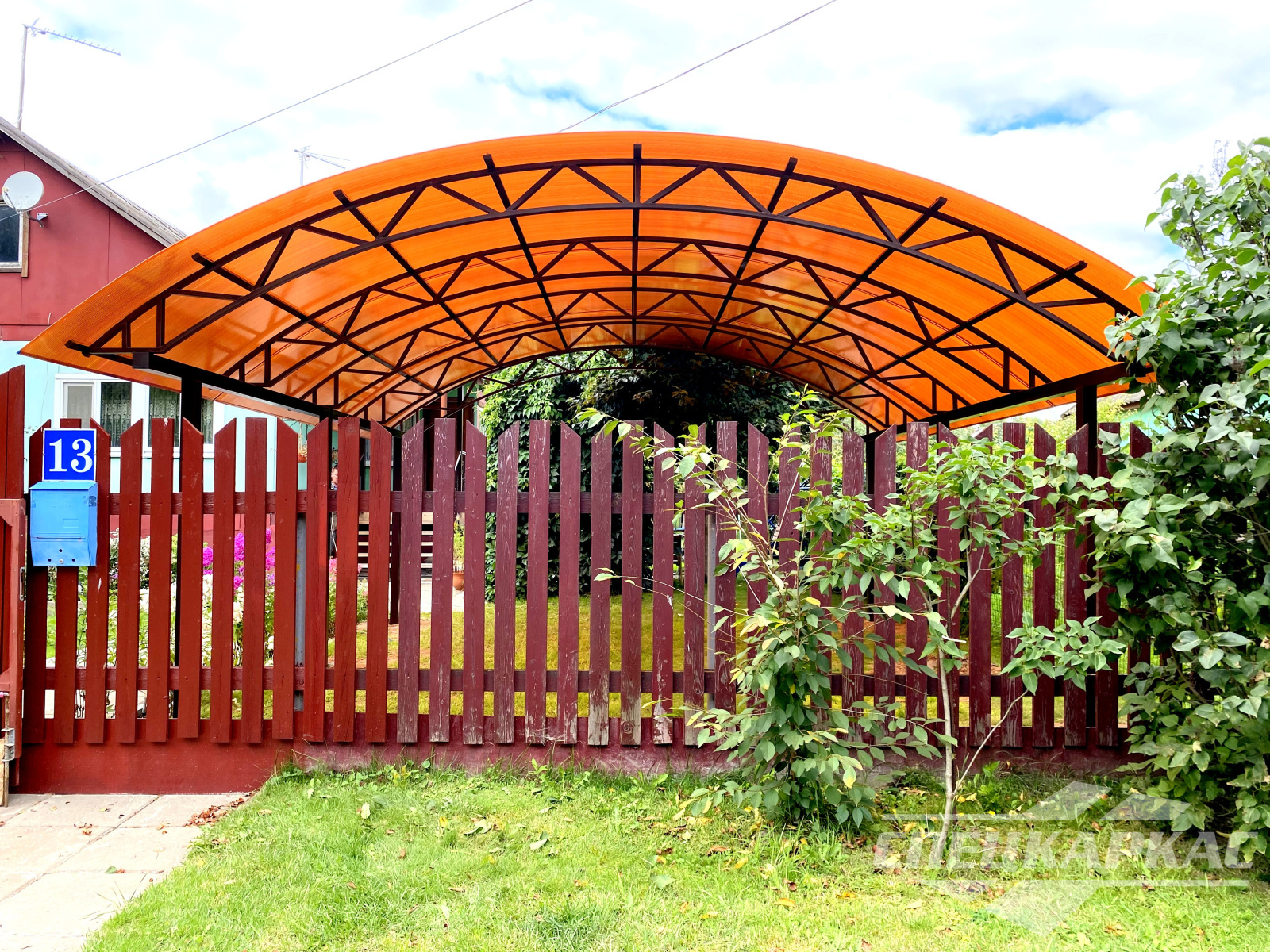 • Наглядно увидеть разницу между разными типами навесов из поликарбоната. Без умения читать чертежи легко обойтись, если перед глазами есть фотографии. В галерее от «Спецкаркас» можно рассмотреть конструкционные различия между, например, навесами из поликарбонатами к дому и моделями для двора. Также на фото без труда получится разглядеть отличия в устройстве односкатных, двускатных, арочных укрытий.